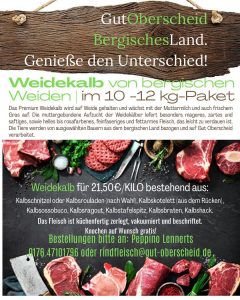 Das Premium-Weidekalb wird auf der Weide gehalten und wächst mit der Muttermilch und auch frischem Gras auf. Die muttergebundene Aufzucht unserer Weidekälber liefert besonders mageres, zartes und saftiges, sowie helles bis rosafarbenes Fleisch. Es ist besonders feinfaserig, mager und leicht zu verdauen. Die Tiere werden von ausgewählten Bauern aus dem bergischen Land bezogen und auf Gut Oberscheid verarbeitet.
