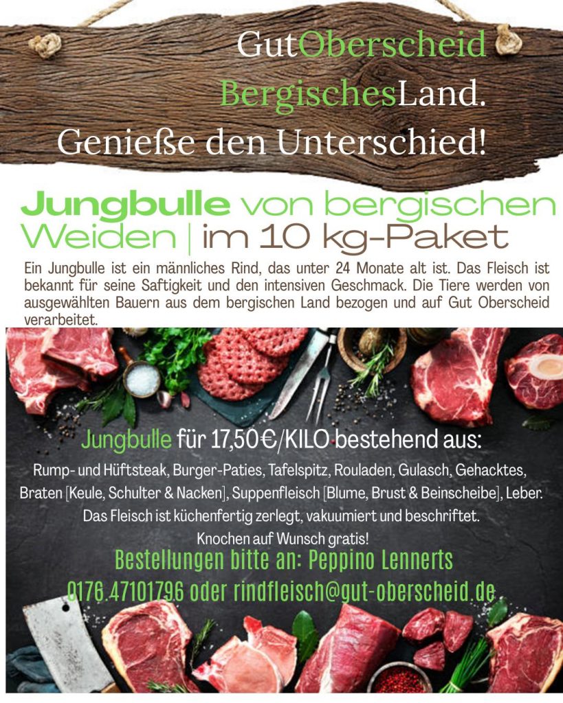 Ein Jungbulle ist ein männliches Rind, das unter 24 Monate alt ist. Das Fleisch ist bekannt für seine Saftigkeit und den intensiven Geschmack. Die Tiere werden von ausgewählten Bauern aus dem bergischen Land bezogen und auf Gut Oberscheid verarbeitet.