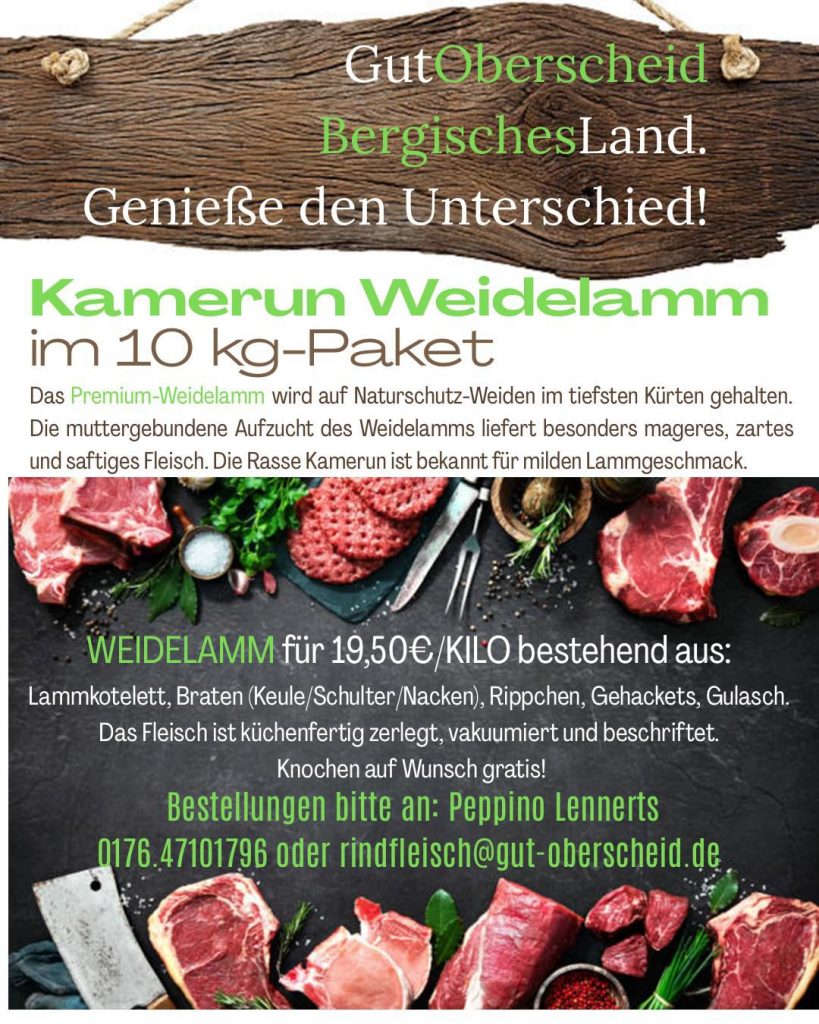 Das Premium-Weidelamm wird auf Naturschutz-Weiden in Kürten gehalten. Die muttergebundene Aufzucht des Weidelamms liefert besonders mageres, zartes und saftiges Fleisch. Die Rasse Kamerun ist bekannt für milden Lammgeschmack.